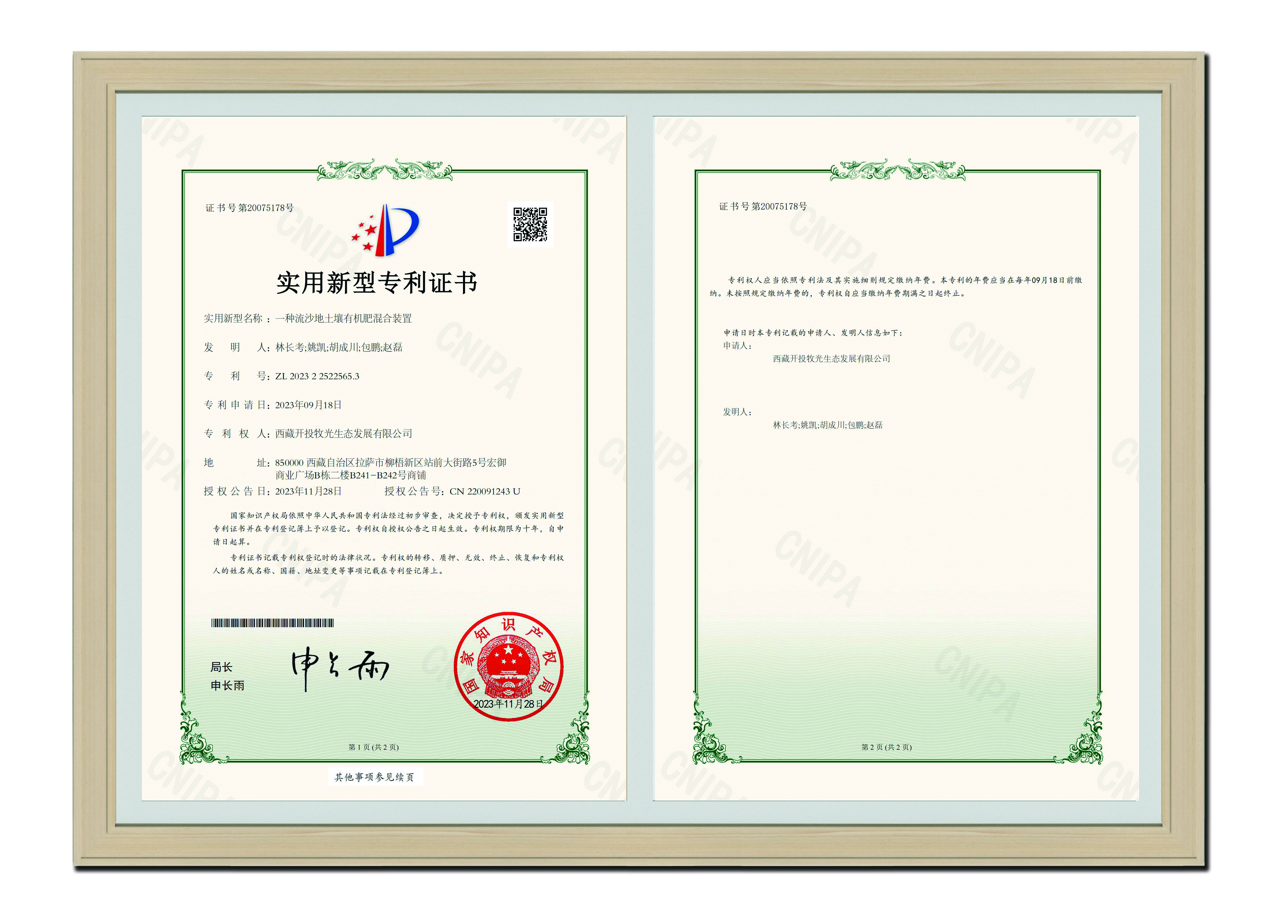 2023年11月28日 一種流沙地土壤有機肥混合裝置-實用新型專利證書-西藏開投牧光生態發展有限公司