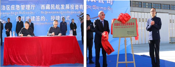 洪力和祁騰武分別代表西藏自治區(qū)應(yīng)急管理廳、西藏民航發(fā)展投資有限公司簽訂戰(zhàn)略合作框架協(xié)議。洪力和付玉壽共同為西藏航空應(yīng)急救援基地揭牌。活動(dòng)現(xiàn)場(chǎng),與會(huì)領(lǐng)導(dǎo)、嘉賓還一同觀摩AC系列直升機(jī),并詳細(xì)了解飛機(jī)性能。