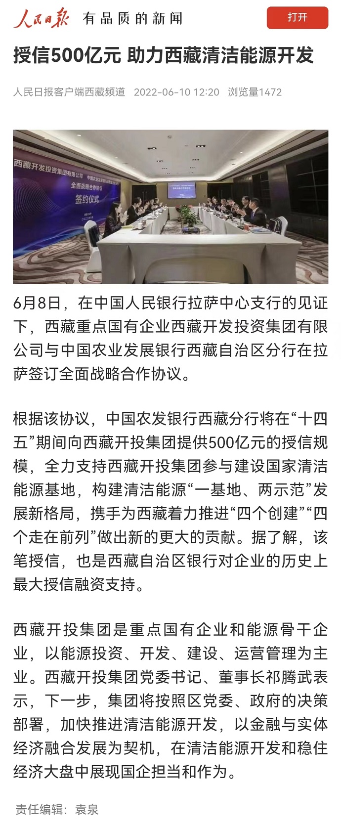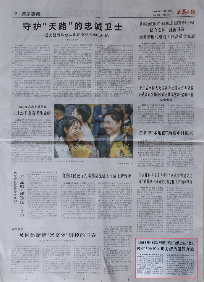 (編者按)6月10日,《人民日報》客戶端西藏頻道報道了《授信500億元 助力西藏清潔能源開發(fā)》。《西藏日報》2022年6月10日在第2版“高原要聞”欄目刊登文章,報道《授信500億元|西藏開投集團與中國農(nóng)發(fā)行西藏分行簽訂全面戰(zhàn)略合作協(xié)議》。西藏電視臺2022年6月10日在西藏電視臺影視文化頻道《今晚九點》欄目報道了《授信500億元|西藏開投集團與中國農(nóng)發(fā)行西藏分行簽訂全面戰(zhàn)略合作協(xié)議》,《珠峰云》平臺同步播放。新華網(wǎng)、經(jīng)濟日報、西藏衛(wèi)視、西藏日報客戶端、網(wǎng)信西藏、今日頭條等媒體均報道了相關(guān)新聞。全文如下: