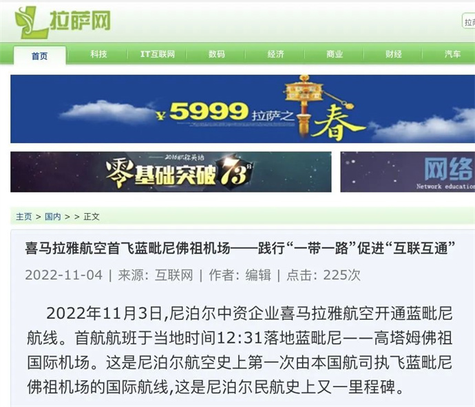 中華網、中國網、中企網、中國日報、光明日報、中國旅游新聞網、中國西藏新聞網、拉薩新聞網等媒體報道喜航開通加德滿都至藍毗尼航線