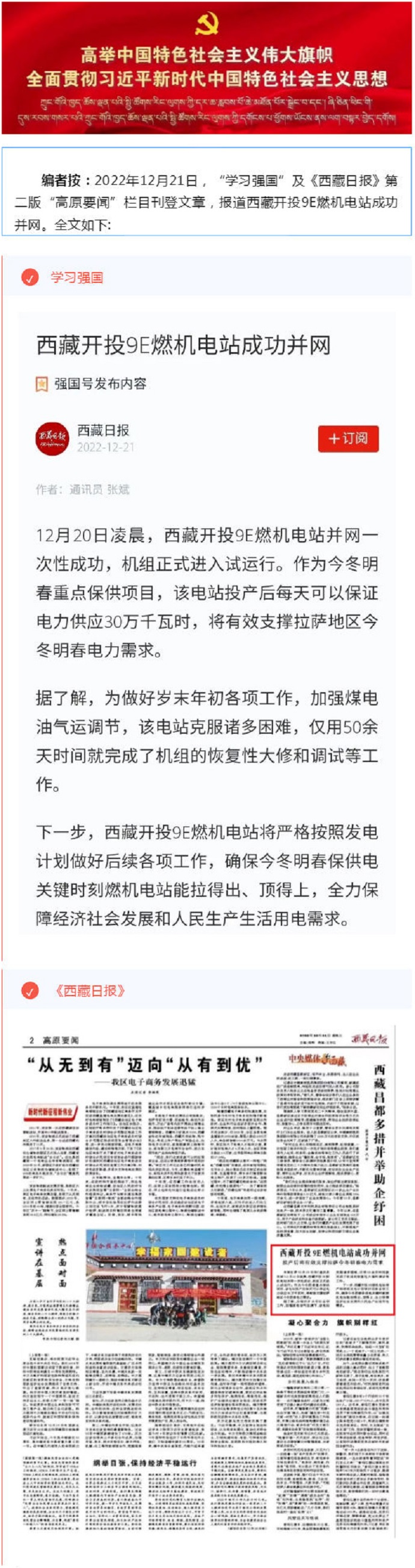 “學習強國”、《西藏日報》報道西藏開投9E燃機電站成功并網