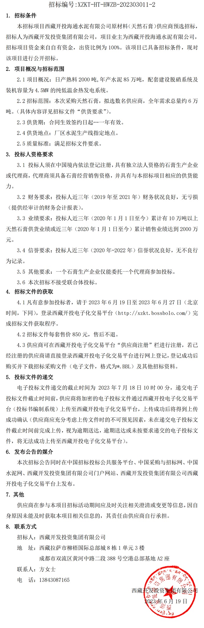 西藏開投海通水泥有限公司原材料(天然石膏)供應商預選招標公告(二次)