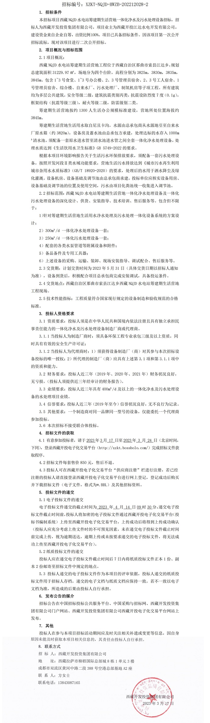 西藏 NQJD 水電站籌建期生活營(yíng)地一體化凈水及污水處理設(shè)備招標(biāo)公告