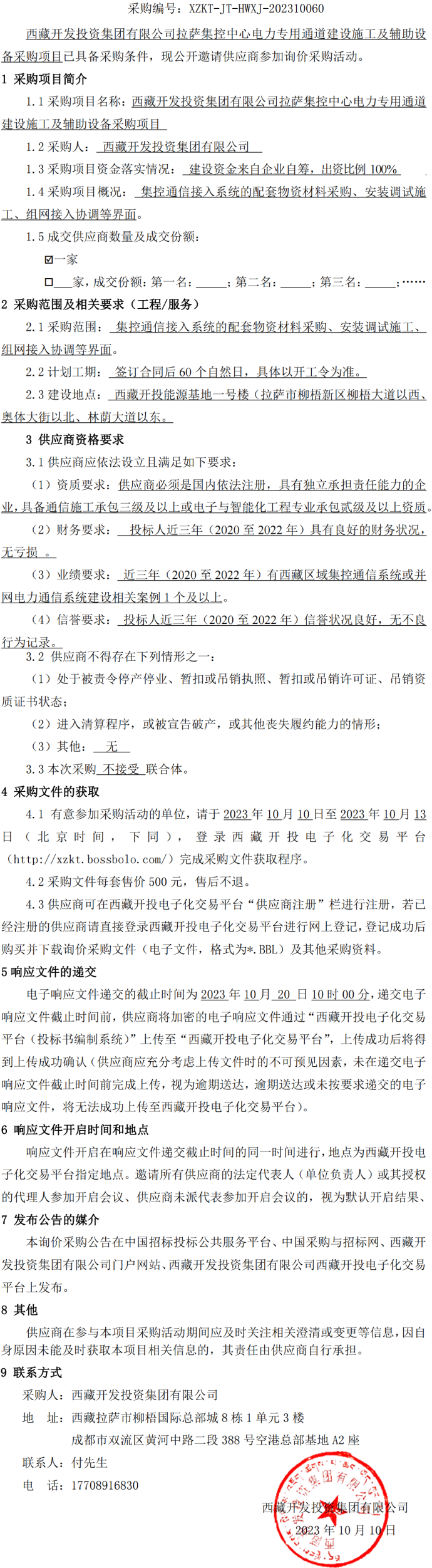 西藏開發投資集團有限公司拉薩集控中心電力專用通道