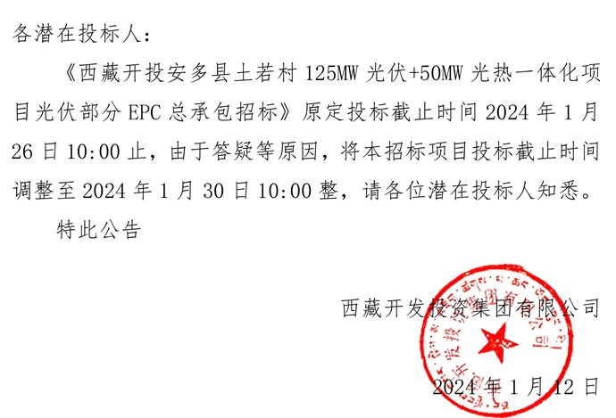 體化項目光伏部分EPC總承包招標》投標截止時間的公告
