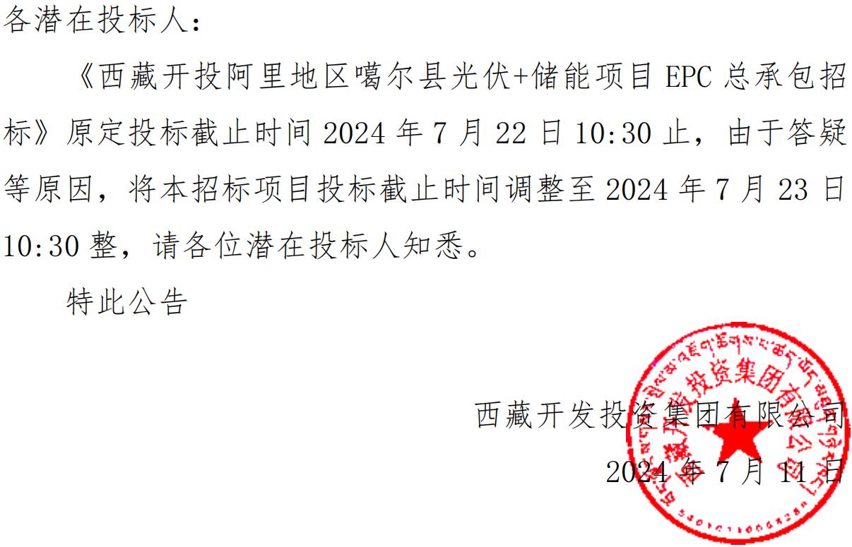 關于延長《西藏開投阿里地區噶爾縣光伏+儲 能項目 EPC 總承包招標》投標截止時間的公告