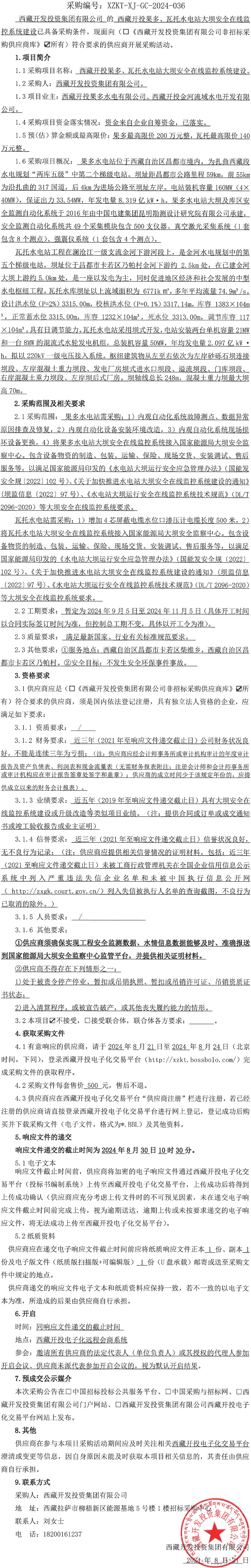 西藏開投果多、瓦托水電站大壩安全在線監(jiān)控系統(tǒng)建設(shè)詢價(jià)采購公告