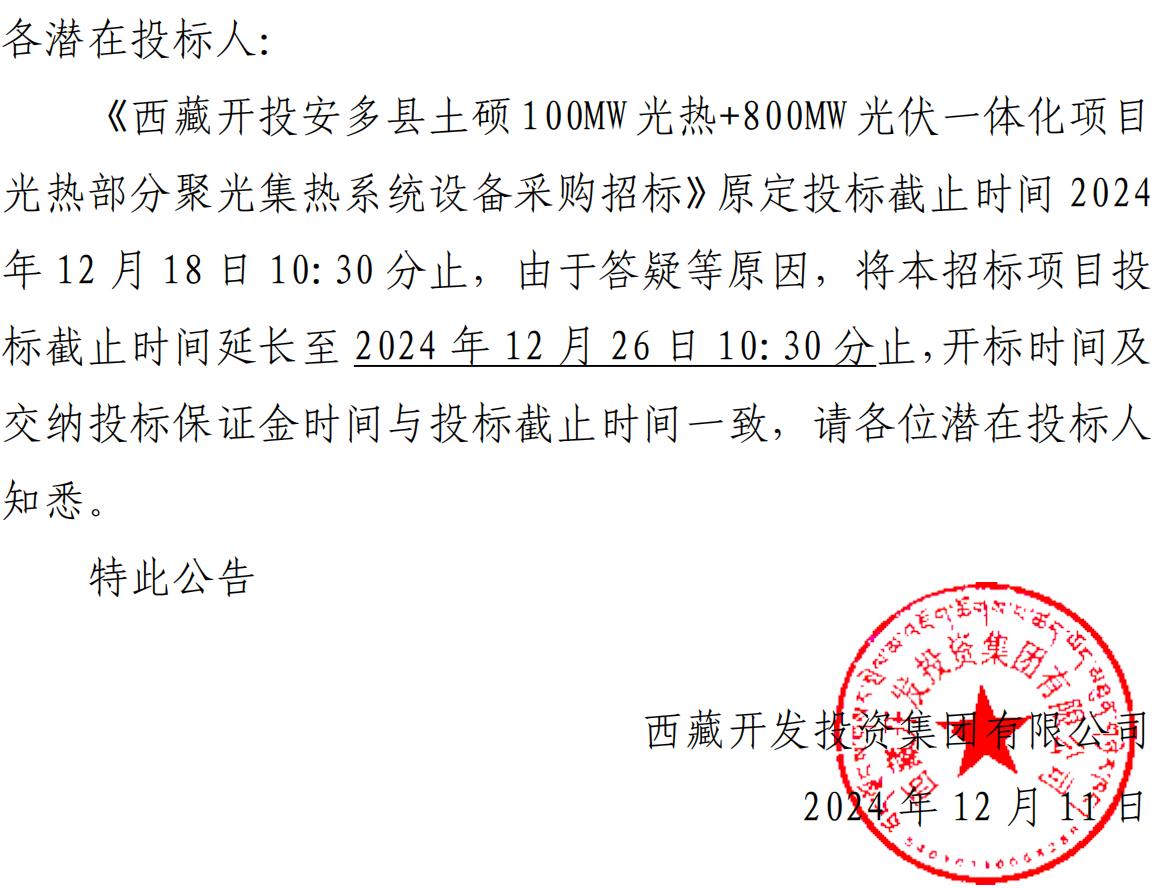 關(guān)于延長《西藏開投安多縣土碩100MW光熱+800MW光伏一體化項(xiàng)目光熱部分聚光集熱系統(tǒng)設(shè)備采購招標(biāo)》投標(biāo)截止時間的公告