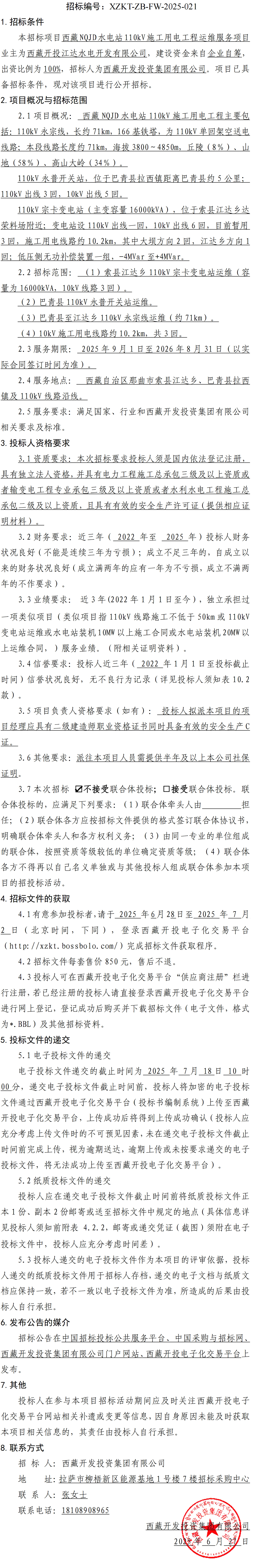 西藏NQJD水電站110kV施工用電工程運維服務招標公告
