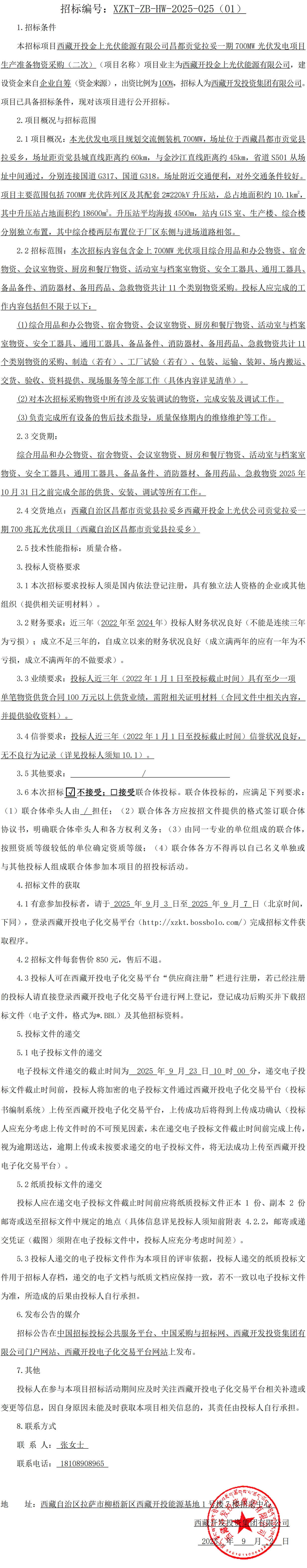 西藏開投金上光伏能源有限公司昌都貢覺拉妥一期 700MW 光伏發電項目生產準備物資采購(二次)招標公告